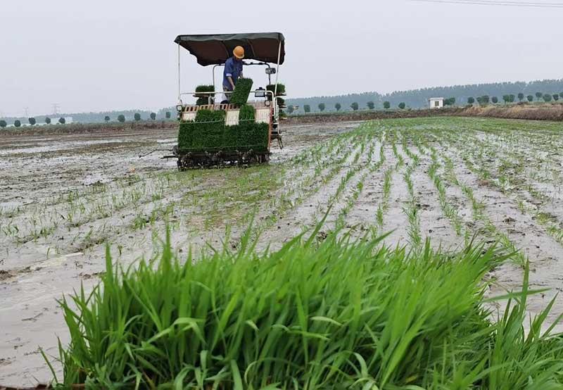 在松滋基地內,5臺插秧機伴隨著隆隆的機器轟鳴,在連片的農田中來回穿梭,以每小時5畝的速度高效栽插,2天便可完成基地500畝再生稻插秧作業,較傳統人工插秧效率提升超15倍,人工成本大幅降低。同時,機器作業嚴格將秧苗行距、株距、深度誤差控制在1厘米內,確保插秧更整齊、栽插深度更精準,有利于秧苗的生長和產量提高。